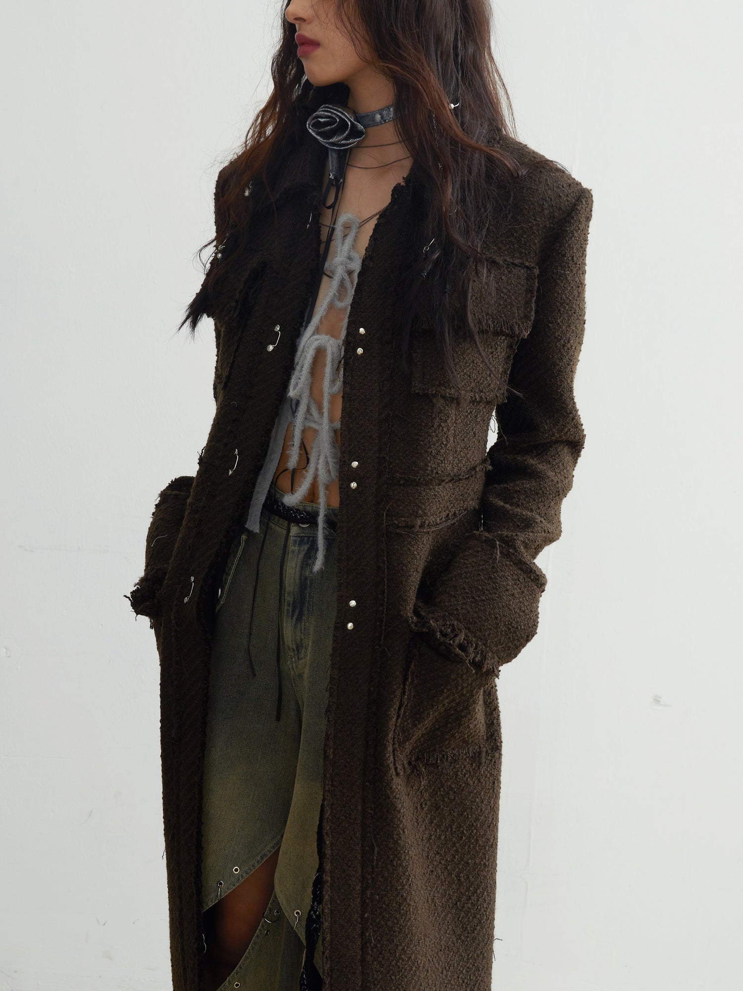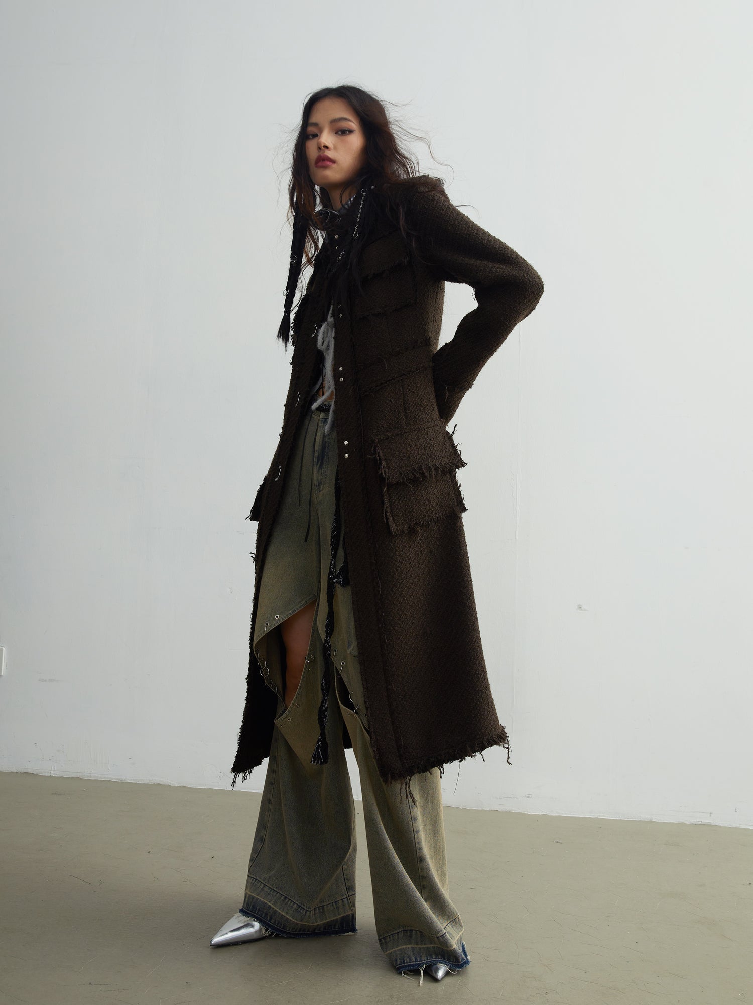 This luxury high quality Tweed Raw Edge Tassels Long Coat is made of a durable tweed and woolen fabric, ensuring lasting warmth and style. With limited pieces available, this unique and timeless coat is perfect for those looking to make a statement with their outerwear.